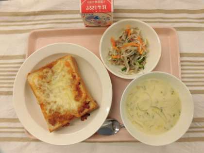 カレーツナトースト コーンポタージュ もやしのサラダ 牛乳