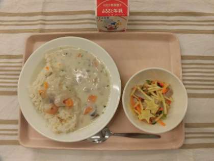 えびクリームライス じゃが芋のハニーサラダ 牛乳