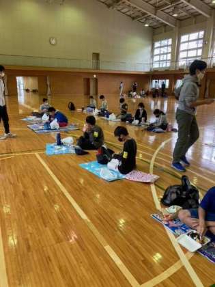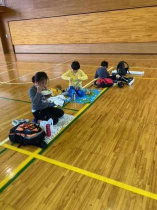 バスの中ではミニオンを観て楽しく過ごしました。雨が降っているので体育館でお弁当を食べます。