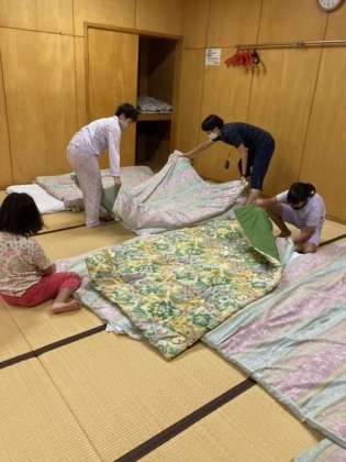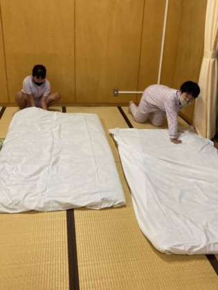 就寝準備です。協力してお布団を敷きました。