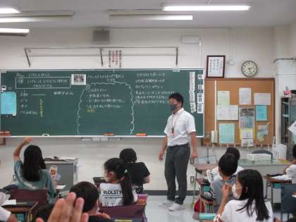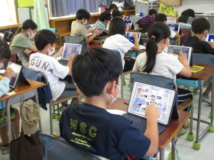 社会科 ごみの処理と再利用「資源のゆくえ」の授業です。資源はどのように再利用されるのか、映像を見たり、タブレットを使用してクイズ形式で再利用について学習したりしました。