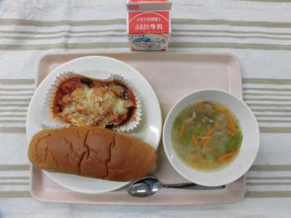 黒砂糖パン なすとポテトのミートグラタン レタススープ 牛乳