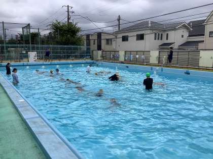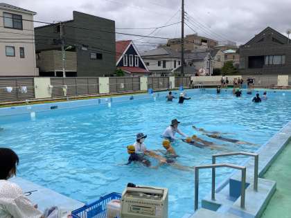 次に、けのびなどの浮いて進む運動やふし浮き大の字浮きなどの浮く運動を行いました。