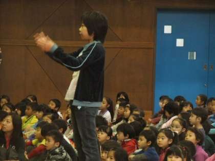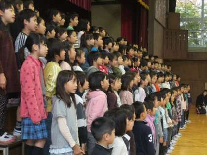 3年生の元気な歌声が体育館に響き渡りました。忍タマ乱太郎の
