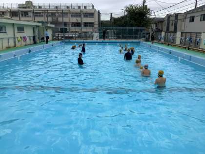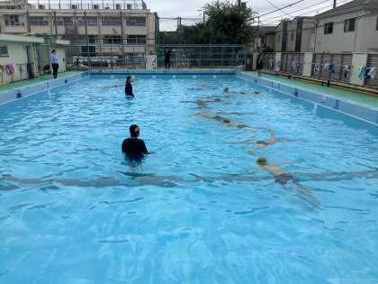 その後、プールの横を使い、クロールや平泳ぎを行いました。
