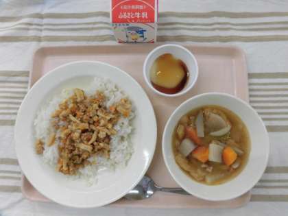 高野豆腐のそぼろ丼 豚汁 お月見白玉団子 牛乳