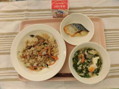 かやくごはん 鯖の文化干し にらたま汁 牛乳