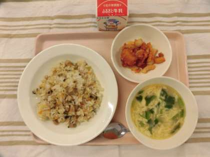 焼き豚チャーハン イカのチリソース 中華風たまごソース 牛乳