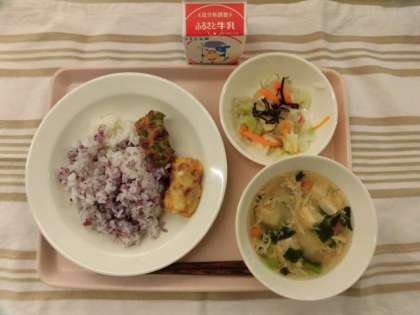 ゆかりごはん 竹輪の二色揚げ かきたま汁 昆布サラダ 牛乳