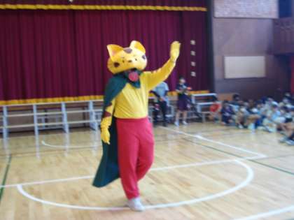 次のコーナーは「つるニャンができるまで」です。キャラクターの最終選考に残ったイラストも映し出されました。そこで、つるニャン登場。子供たちは大興奮でした。