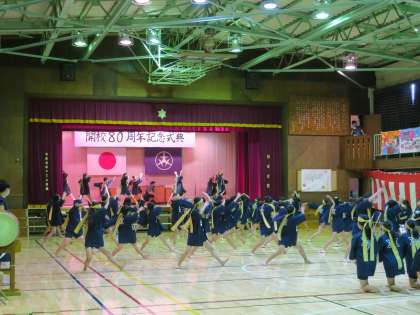 今日の午後は5.6年生が参加して、80周年記念式典のリハーサルが行われました。5年生の力強いソーラン節でオープニングが始まりました。