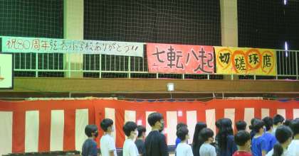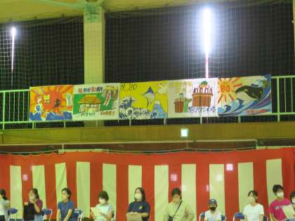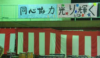体育館の中は全校児童のモザイクアート共同制作や5,6年生が作った旗で祝賀ムードに包まれています。