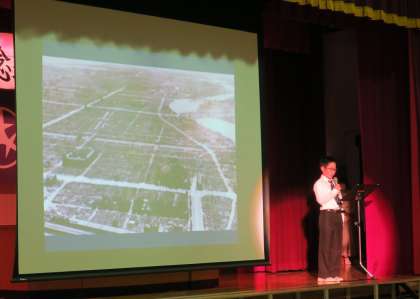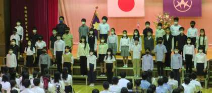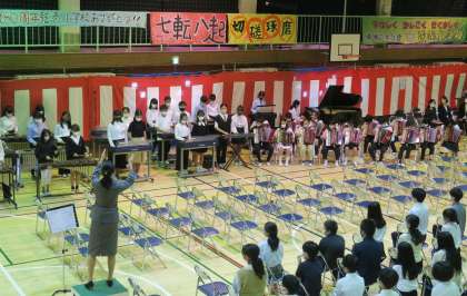 6年生から弦巻小学校の歴史紹介、合奏「ジュピター」、群読「谷川俊太郎の“生きる”」、合唱「いのちの歌」の発表がありました。