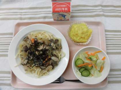 和風きのこスパゲッティ フレンチサラダ お月見スイートポテト 牛乳