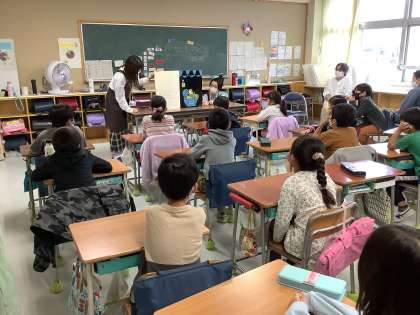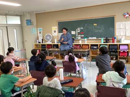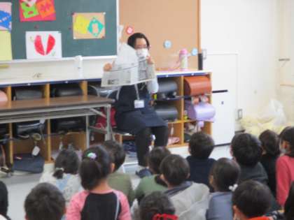 2年生は、中央図書館の方に、読み聞かせをしていただきました。大型紙芝居や落語、外国のお話、新聞紙の折り紙のお話等、楽しく聞きました。