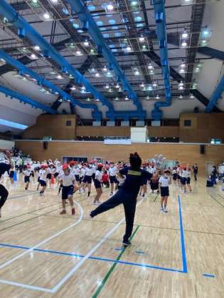 踊る時も全力!これが、6組の合言葉です。先生もノリノリです。