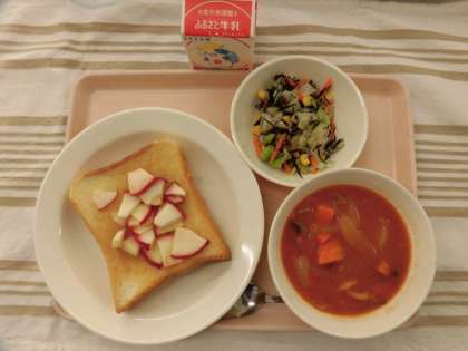 アップルトースト 米粉のポークシチュー ひじきとコーンのサラダ 牛乳