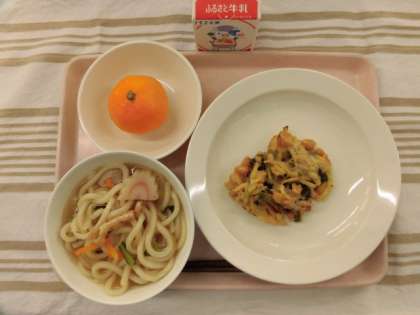 こぎつねうどん 明日葉のかき揚げ みかん 牛乳