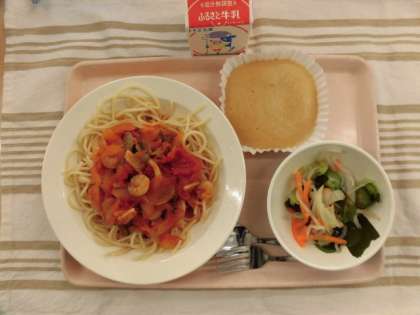 スパゲッティペスカトーレ わかめサラダ 米粉のきな粉蒸しパン 牛乳