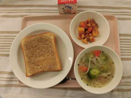 セサミトースト チキンヌードルスープ ポークビーンズ 牛乳