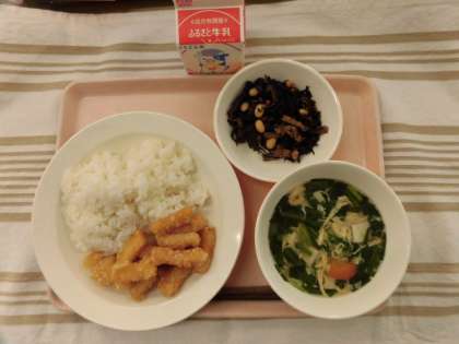 ごはん イカのかりんと揚げ にらたま汁 ひじきの炒め煮 牛乳