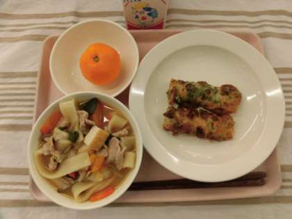 ほうとう 竹輪の磯辺揚げ みかん 牛乳