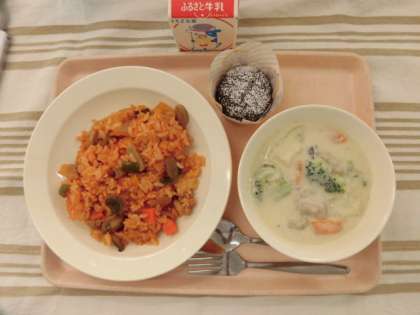 チキンライス クリームシチュー 米粉のココアマフィン 牛乳