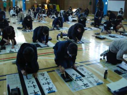 昨日、今日と3年生以上は体育館で書き初めを行っています。