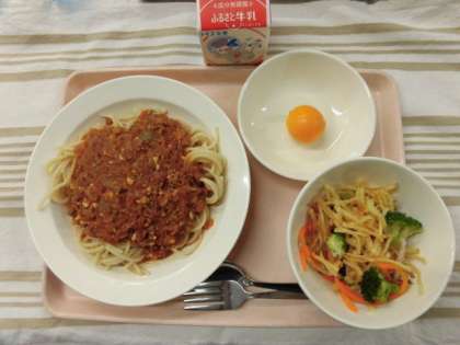 スパゲッティミートソース じゃが芋のハニーサラダ きんかん 牛乳
