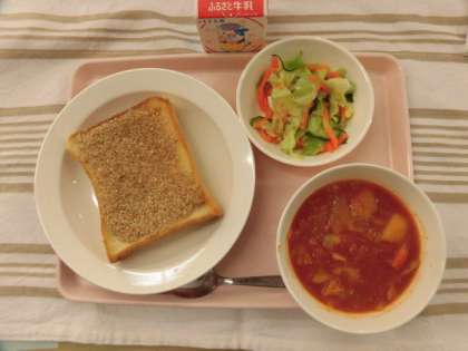 セサミトースト レンズ豆のトマトシチュー フレンチサラダ 牛乳