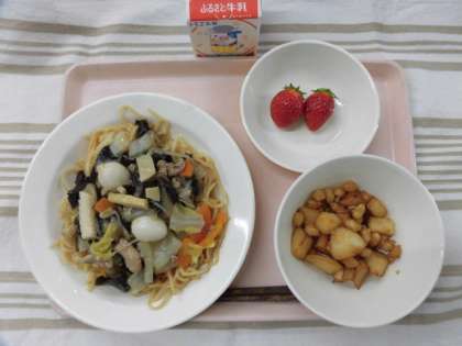 あんかけ焼きそば ビーンズポテト いちご 牛乳
