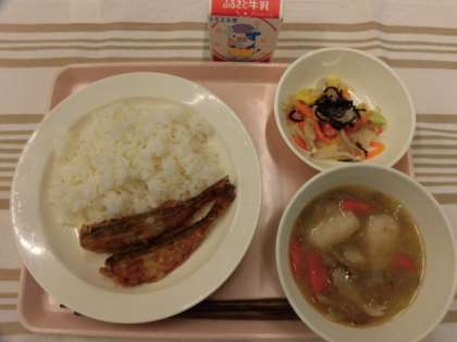 あきたこまちのごはん ハタハタのから揚げ きりたんぽ鍋 昆布サラダ 牛乳
