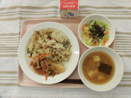 炊き込みごはん タラのきのこあんかけ 豆腐とわかめのみそ汁 和風サラダ 牛乳