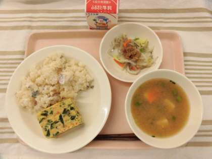 鯛めし 牛乳 千草たまご焼き 鯛のみそ汁 ごま酢かけ 牛乳