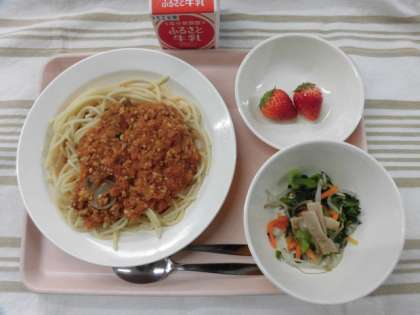 スパゲッティミートソース 小松菜とハムのサラダ いちご 牛乳