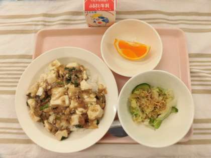マーボー豆腐丼 キャベツじゃこサラダ デコポン 牛乳