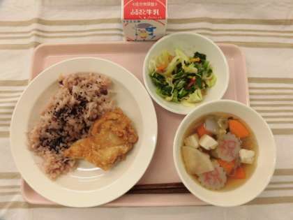 お赤飯 とり肉のから揚げ お祝いけんちん汁 菜花のおひたし 牛乳