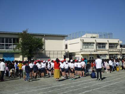 今日の朝は、久しぶりに校庭で行った全校朝会でした。