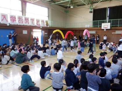 今日は1年生を迎える会がありました。1、2、6年生は体育館で、3〜5年生はテレビ中継を見て参加しました。