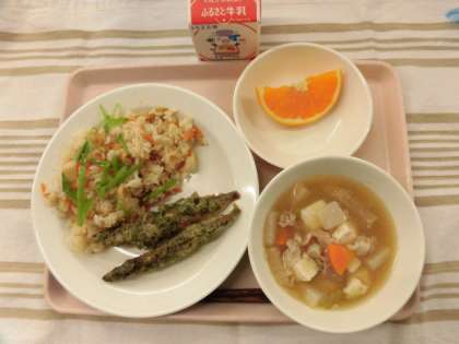 たけのこごはん シシャモの磯辺揚げ 豚汁 清見オレンジ 牛乳