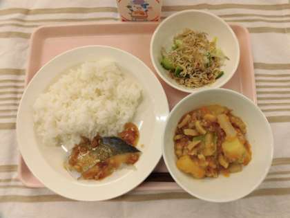 ごはん 鰆のねぎソースかけ 新じゃが芋のそぼろ煮 キャベツじゃこサラダ 牛乳