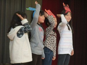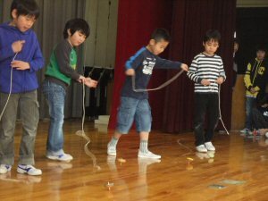大勢の子どもたちが自分が得意としている技を全校児童の前で