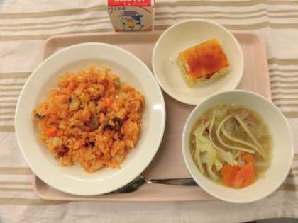 チキンライス ポテトオムレツ ヌードルスープ 牛乳