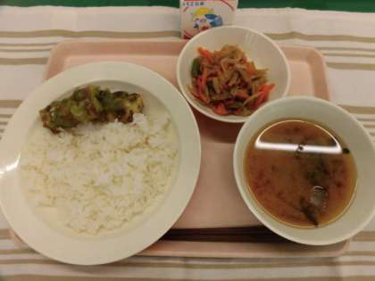 ごはん 竹輪のお茶の葉揚げ じゃが芋のみそ汁 春ごぼうのきんぴら 牛乳