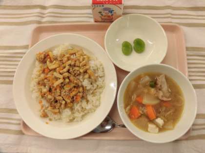 高野豆腐のそぼろ丼 豚汁 ゆでそら豆 牛乳