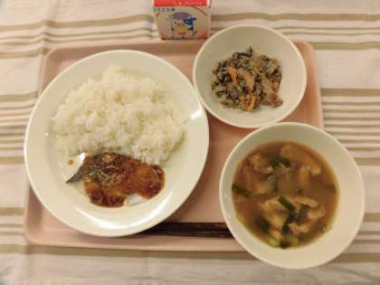 ごはん サワラの香味焼き にらのみそ汁 卯の花の炒り煮 牛乳