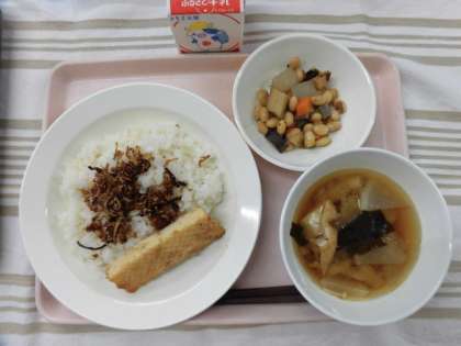 胚芽米ごはん 骨太ふりかけ イカの一味焼き みそ汁 五目豆 牛乳