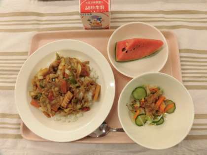 ホイコーロー丼 中華サラダ 小玉すいか 牛乳
