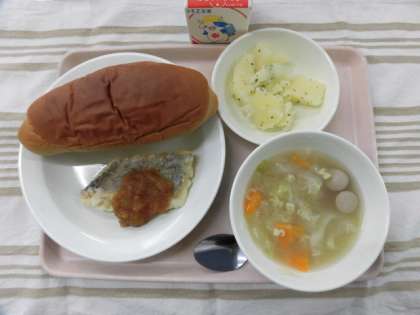 黒砂糖パン ホキのBBQソースかけ ABCスープ 粉吹芋 牛乳
