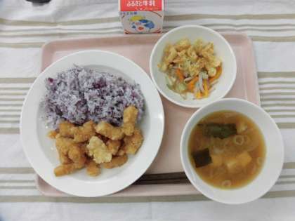 ゆかりごはん イカのかりんと揚げ みそ汁 カリカリ油揚げのサラダ 牛乳